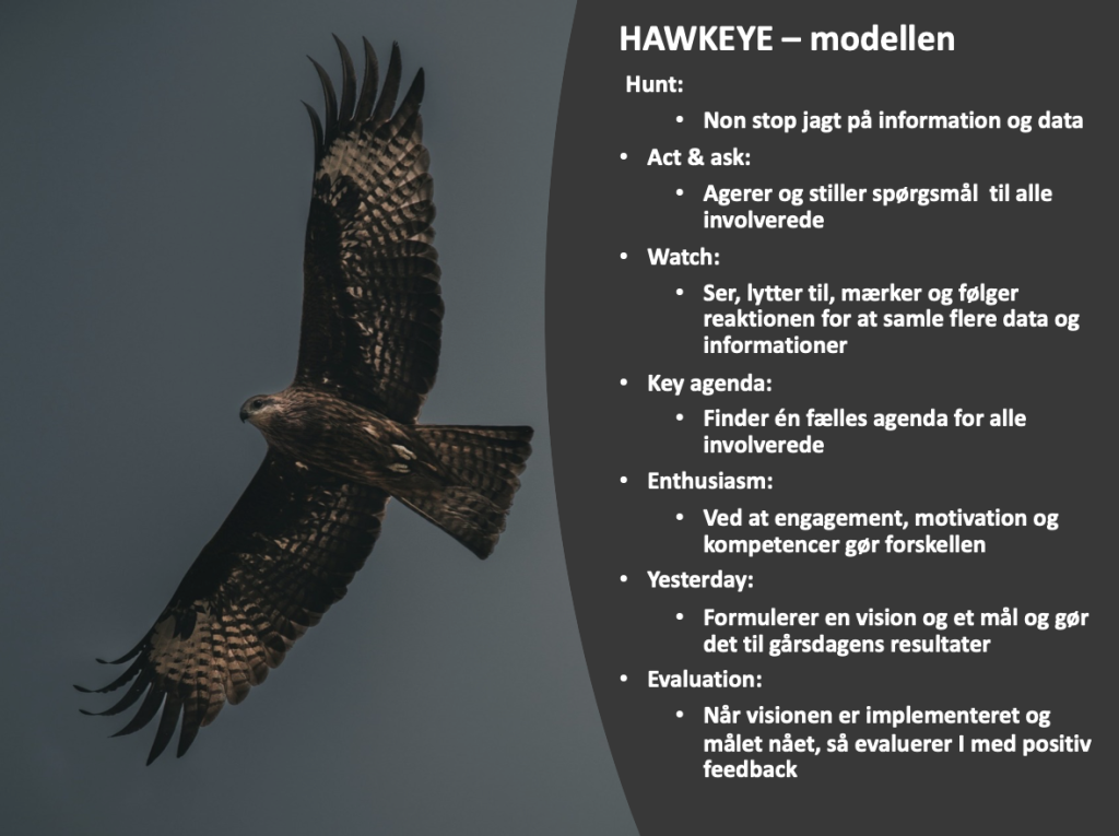 We call the leadership model for the Excellent Middle Manager the HAWKEYE model. HAWKEYE consists of seven elements. The seven elements are implemented as iterative processes, simultaneously or separately, linked to each and every leadership task where relevant.
